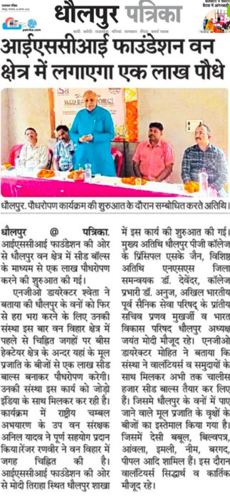 Mr. Suren Jain lauded the ISCI Foundation's initiative, highlighting the remarkable endeavor to transform Dhaulpur's forests into lush expanses once again. He emphasized the importance of engaging the younger generation in such projects for environmental preservation. Dr. Devender and Dr. Anuj pledged their full support of NSS to this cause, with a promise to involve NSS students in reforestation activities. Shri Pranav Mukherjee noted that the seed ball technique has been successfully employed for afforestation in southern India and commended ISCI Foundation for bringing it to Dhaulpur.